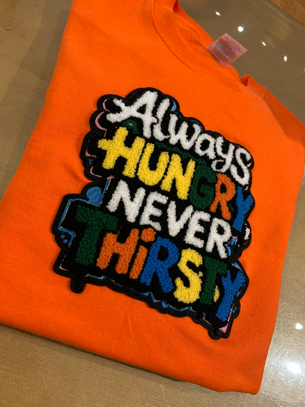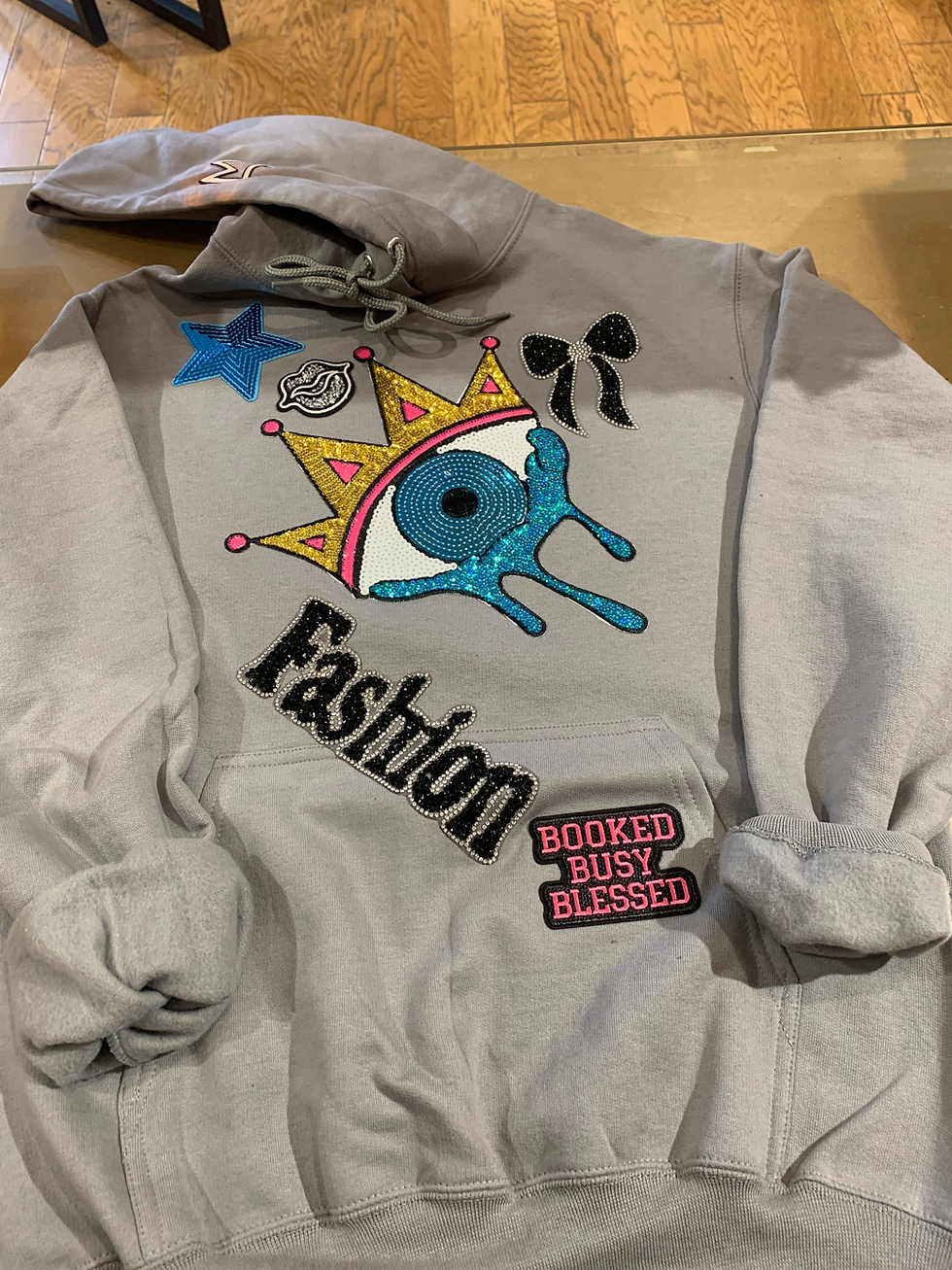 This unisex fit hoodie comes with chenille inspired PATCH that is sewn on the hoodie. Women typically go down a size.